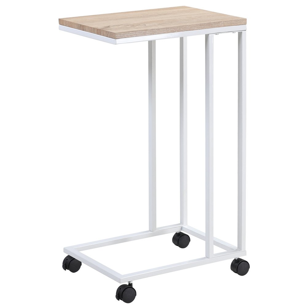 Praktisch en modern bijzettafeltje met wieltjes in houtlook! Met of zonder wielen: De bijzettafel heeft 4 verwijderbare poten. De poten kunnen in een handomdraai worden vervangen door vier lichtlopende zwenkwielen. Hierdoor is de tafel zeer gemakkelijk te verplaatsen. Om te voorkomen dat hij op het bed of de bank wegglijdt bevatten 2 van de 4 wielen een rem. Zo dichtbij mogelijk: De tafel kan onder het bed of de bank worden geschoven. (De onderkant moet ten minste 7 cm hoog zijn). Zo kun je je geliefde eindelijk trakteren op ontbijt op bed of je thee comfortabel drinken en binnen handbereik op de tafel zetten. Perfect gevormd ontwerp: Dankzij het niet-kantelbare frame met C-vormige basis en het geometrische patroon past de tafel harmonieus in elk huis. Bericht: De afstand tussen het frame en de vloer is 7 cm. De bank moet daarom in het onderste gedeelte hoger zijn dan 7 cm om de bijzettafel eronder te kunnen schuiven. Bescherm de tafel tegen direct zonlicht, vocht en water om de